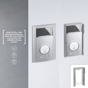 Je nach Ausführung bestehen die Frontblenden der Türstation aus Aluminium oder widerstandsfähigem Zinkdruckguss (ZAMAK) mit einer Schlagfestigkeit von IK 10. Das bedeutet höchsten Schutz vor mechanischen Einwirkungen. Strahlwasserschutz (IP 54) und Staubschutz sind in beiden Ausführungen selbstverständlich.