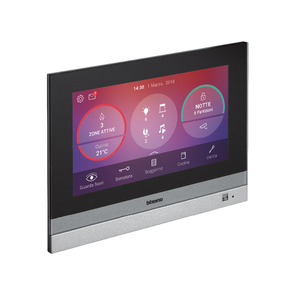 Der Hometouch ist sowohl Steuerzentrale für Ihre MyHOME-Hausautomation als auch Video-Hausstation mit integrierter Smartphone-Anbindung. Über den Hometouch steuern und verwalten Sie Ihre komplette Hausautomation, wie z. B. Licht und Rollladen betätigen, Heizung regeln, Szenarien abrufen, u.v.a.m. Mittels kostenloser App „Door Entry for Hometouch“ bekommen Sie auch die komplette Funktionalität einer Sprechanlage auf Ihr Smartphone (Videobild, Gespräch, Tür öffnen, usw.).