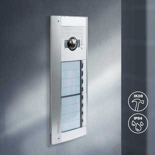 Die Frontblende der Türstation besteht aus widerstandsfähigem Zinkdruckguss (ZAMAK) und ermöglicht eine Schlagfestigkeit von IK 10. Das bedeutet höchsten Schutz vor mechanischen Einwirkungen. Strahlwasserschutz (IP 54) und Staubschutz sind selbstverständlich.