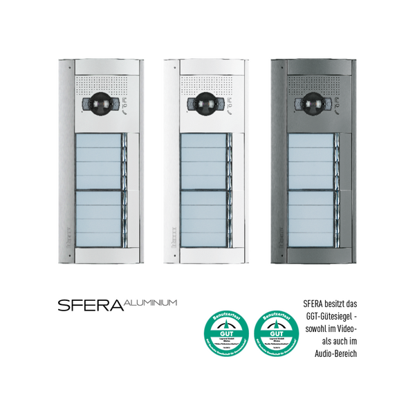 SFERA bietet eine Unmenge an Funktionen, die individuell – je nach Anforderung – kombiniert werden können. Es kann u.a. zwischen Audio- und Videoausführung (u.a. auch mit Night & Day-Kamera), 1- und 2-reihigen Ruftastenmodulen und einer Vielfalt an Zutrittssystemen gewählt werden, wie z.B. Kartenleser, Codelock oder Fingerprintmodul.